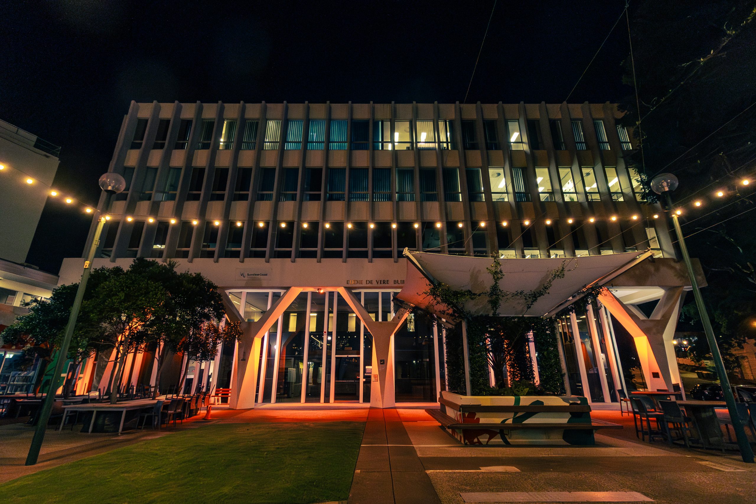 Coolum Civic Centre is a 5 light DMX system with integrated control systems allowing for remote scheduling and colour changing. Lights were installed along the Civic Centre roof on custom hingeable aluminium brackets to allow decorative lighting to shed light down the outside wall of the building.