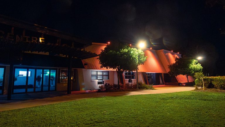 Coolum Civic Centre is a 5 light DMX system with integrated control systems allowing for remote scheduling and colour changing. Lights were installed along the Civic Centre roof on custom hingeable aluminium brackets to allow decorative lighting to shed light down the outside wall of the building.